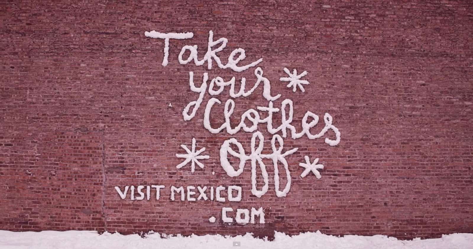 Acción de Street Marketing mediante graffitis con nieve. Para promocionar el turismo en México se utilizó nieve de Chicago y lettering para transmitir frases sugestivas sobre las suaves temperaturas y paisajes idílicos del país.